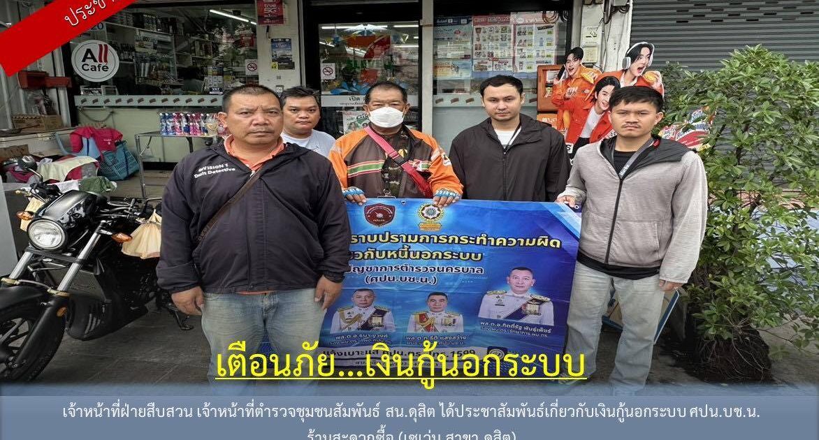 1.ร้านสะดวกซื้อ (เซเว่น สาขา ดุสิต) และประชาชนที่มายังสน.ดุสิตโดยมี เครือข่ายชุมชนและประชาชนในชุมชน ให้ความสนใจ โดยทางชุดตำรวจได้ให้คำแนะนำการแก้ปัญหาหนี้นอกระบบตามนโยบายรัฐบาล และ ประชาสัมพันธ์ การแจ้งเบาะแสได้ที่ “ศูนย์ป้องกันปราบปรามการกระทำความผิดเกี่ยวกับหนี้นอกระบบ(ศปน.ตร.)โทร 1599 หรือ สน.ดุสิต โทร 02-241-5043