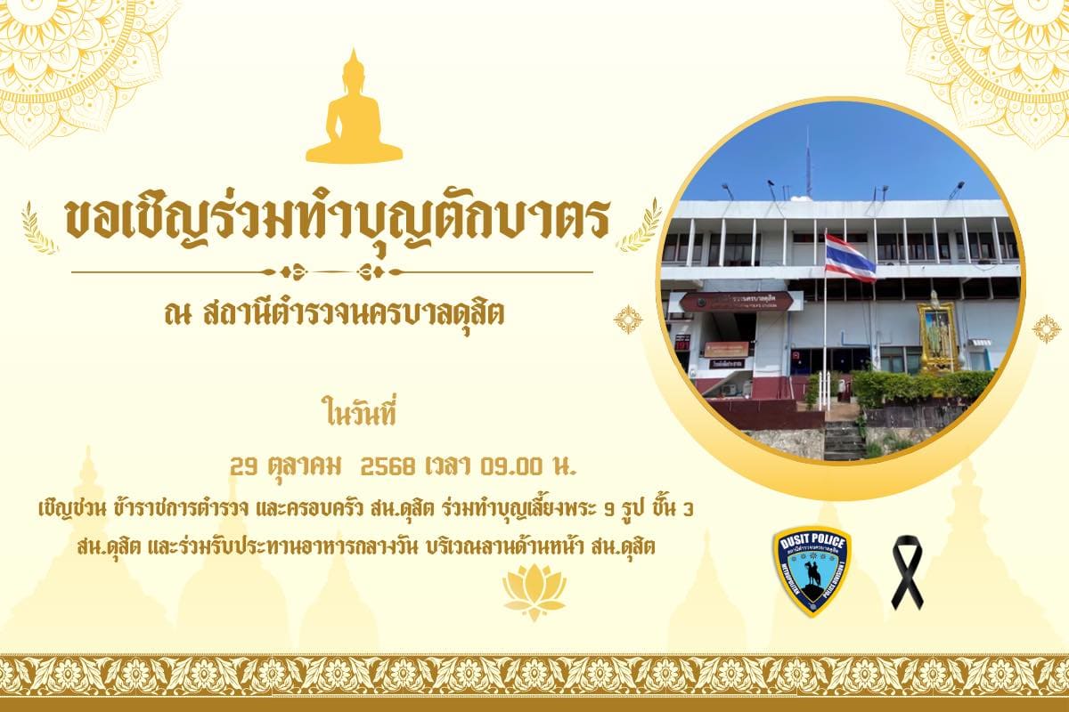 ขอเรียนเชิญข้าราชการตำรวจ ประชาชน และผู้มีจิตศรัทธาทุกท่านร่วมพิธีทำบุญถวายภัตตาหารเพลแด่พระสงฆ์ เพื
